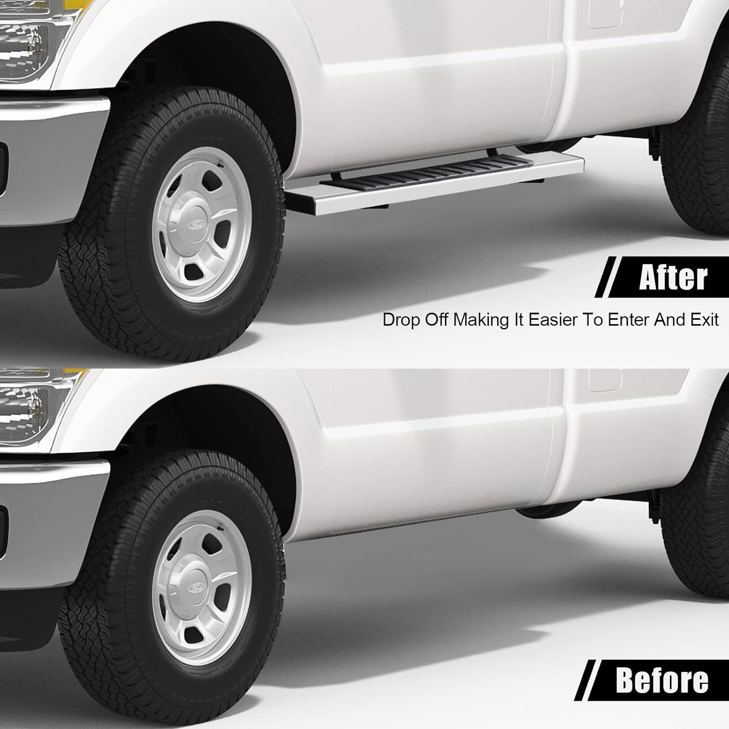 👍「EASY TO INSTALL」: Easy Bolt-on Installation. No Drilling Or Cutting Required. All Mounting Hardware And Installation Instruction Included. Mount The Mounting Brackets Under The Truck First Then The Running Boards. The Attaching Bolts Into A Groove That Allows Them To Slide To The Proper Spot Then Torque Them Down And That's It.